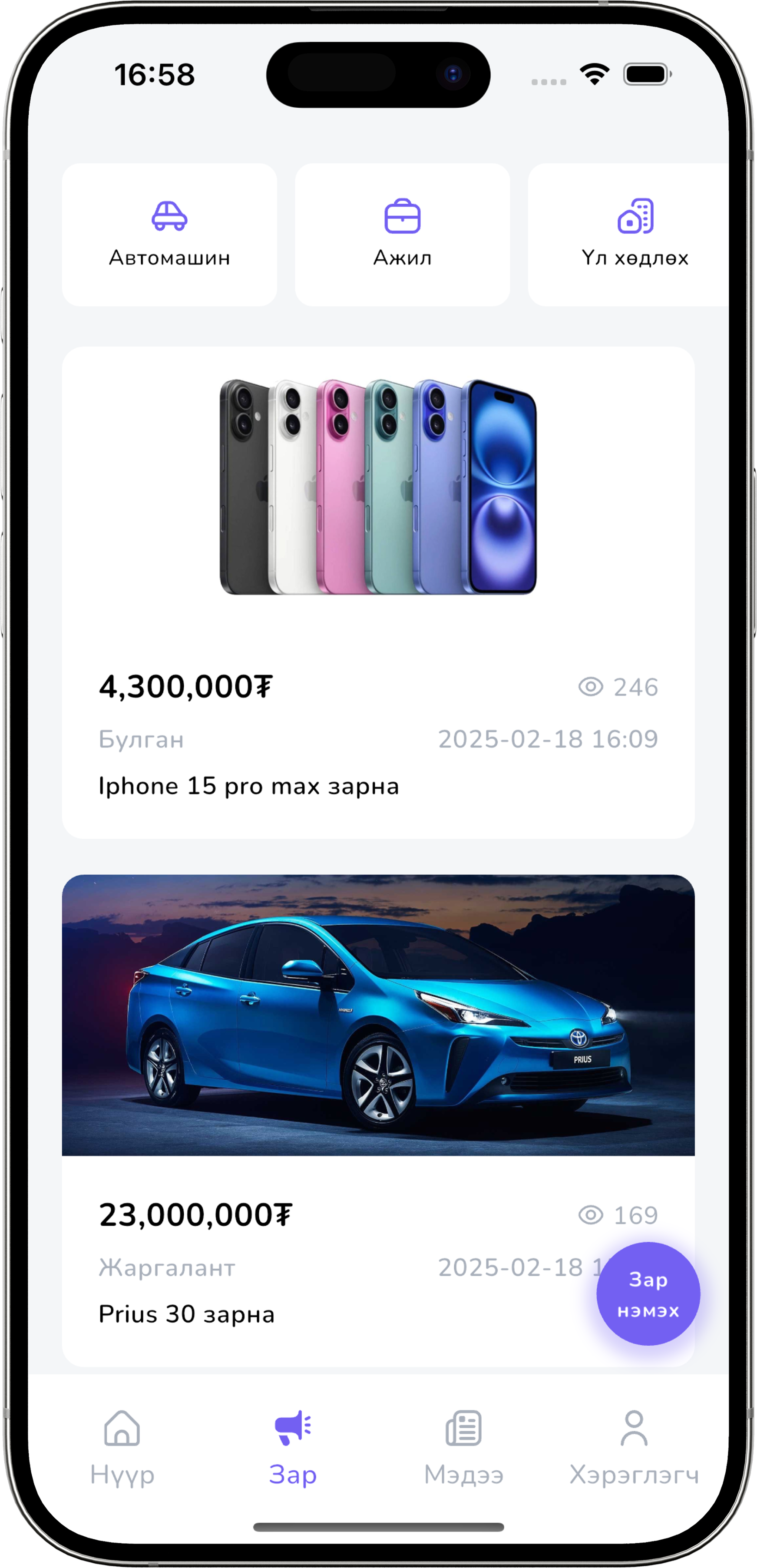 Зар оруулах товчин дээр дарж тохирох ангиллыг сонгон зураг болон мэдээллийн хамт нийтлэнэ